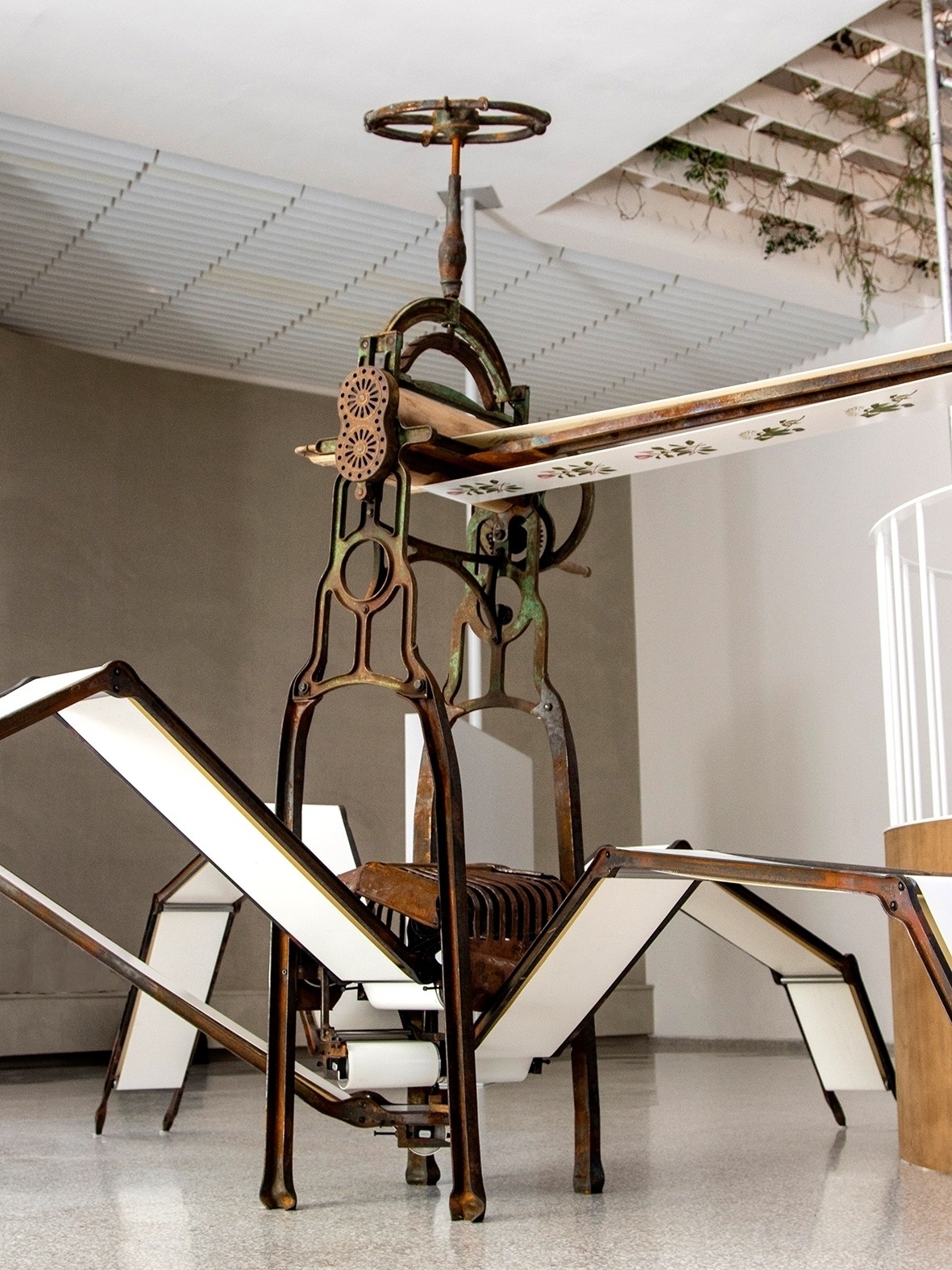 Razavi in particular sought to show the eagerness by which land, people and animals were exploited at the time. She created Kratt: Diabolo No 3, a kinetic, electrically powered sculpture that stands in the middle of the pavilion. The sculpture is inspired by a mythological creature from Estonian folklore. According to the myth, Kratt will come to life when three drops of blood are sacrificed to the devil. After that, Kratt will perform any task, no matter how evil, at the behest of his master. The unscrupulous machine in the pavilion resembles a large spider with a machine belt. On the top band are the drawings of Emilie Rosalie. The mechanism that allows these drawings to be viewed refers to the invisible labor of Indonesian housekeepers in Saal’s artistry. Also, the sharp contrast between the white background and the botanical drawings is a deliberate choice: the white background of Saal’s work cut away the colonial environment, leaving behind a beautiful flower. But on the base of the machine, only a white background can be seen. It doesn’t look unfinished, and at most, as a visitor, you feel like you’ve overlooked something. But there, on those spider legs, something was rather not shown than shown.